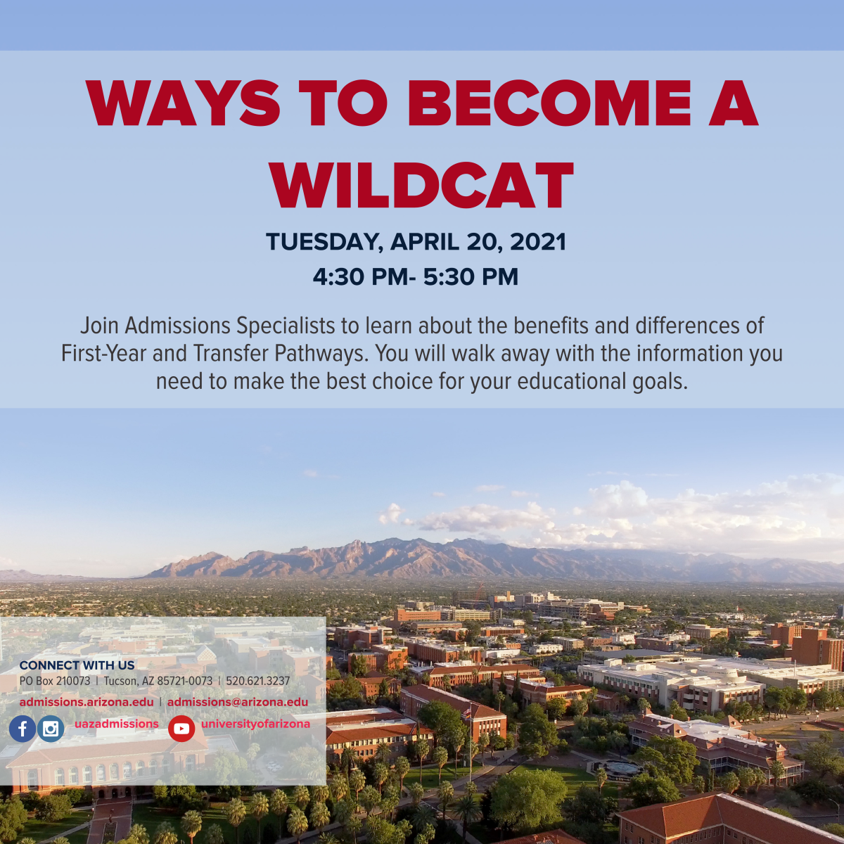 WelcomeWays to Become a WildcatTuesday, April 20, 2021 at 4:30 PM until 5:30 PMUS Mountain Standard Time UTC -07:00Join Admissions Specialists to learn about the benefits and differences of First-Year and Transfer Pathways. You will walk away with the information you need to make the best choice for your educational goals.Registration is no longer available because the registration deadline has passed.